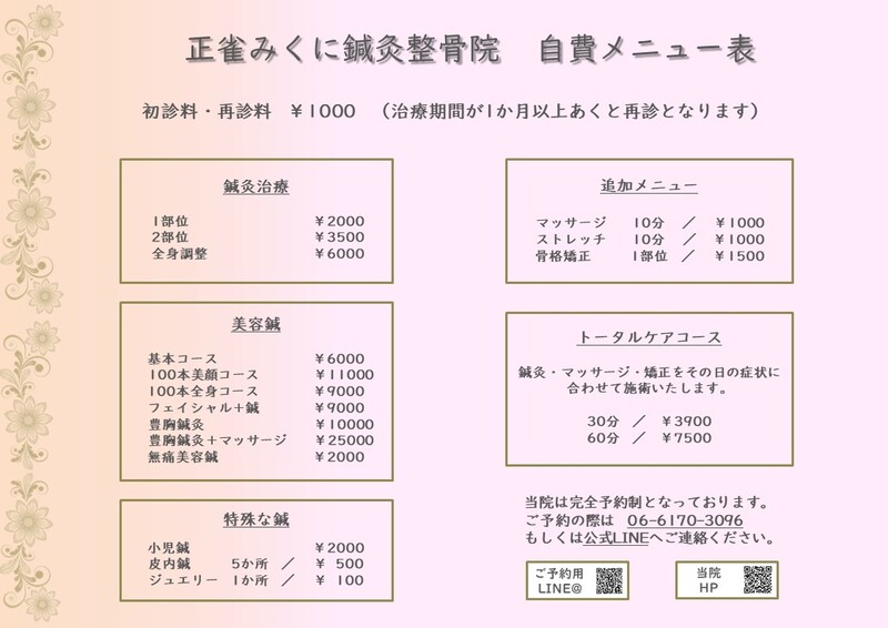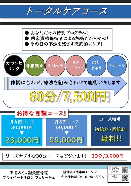 当院は患者様と向き合ってお一人おひとりにあわせた施術がしっかり行えるように、予約制の完全個室にて皆様をお待ちしております。 急性外傷への保険診療に加え、鍼灸・美容鍼灸・小児鍼・エステティック・骨格矯正・トレーニングといった自費メニューが豊富にございますので症状に合わせて選択していただけます。 また当院へは怪我やスポーツ障害などの体調不良だけではなく、ストレスなどの精神的なもの、ダイエット・生活習慣の改善、お子様の発育など、様々なお悩みで多くの方々にご来院いただいております。 私たちは「患者様の数だけ症状があり、その数だけ解決方法がある」と考えて日々施術しております。 公式LINEにて24時間ご予約・ご相談受付けておりますので、どのようなお悩みでもぜひ一度ご相談ください。
