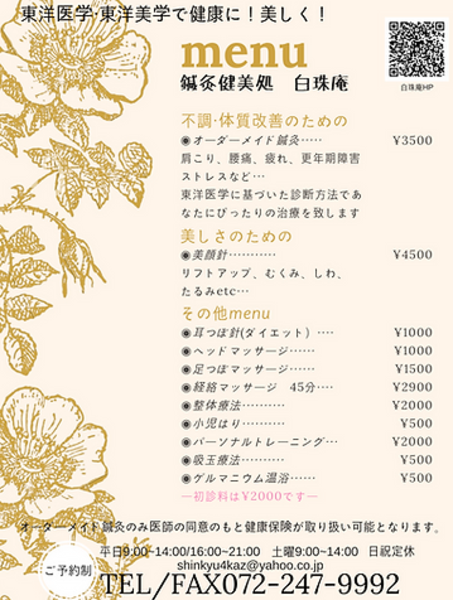 鍼灸健美処 白珠庵 ~施術概念~ 鍼灸師・健美アドバイザーの白石和久です。私は鍼灸師として約20年の間多くの患者様の不調や痛みと向き合い、治療してまいりました。 その経験と研究を基に、地域の皆様のお役に立てるように頑張っていきたいと考えております。 外科手術や投薬を行わず、東洋医学・中医学をベースに、身体が持つ本来の生命力・自然治癒力を活かしたとても健康的で効果的な施術・治療をご提供させていただきます。 ○どこに行っても治らない・・・ ○痛みで日常生活に支障がでる・・・ ○美容針を受けた事があるがイマイチ効果が感じられなかった・・・ などでお困りの方はお気軽にご連絡下さいませ♫ 〜オーダーメイド鍼灸〜 東洋医学に基づいた診断方法(脈診・腹診・舌診等)で、針・灸・パルス・皮内針・吸玉etc... などを用いてあなたの身体ににぴったりの施術を行います。 〜美容鍼灸〜 コラーゲン機能の活性化により、艶、潤い、肌の張りがよみがえります。 新陳代謝促進・血行の改善によりシミ・くすみ・くま・むくみ・肌荒れなどが改善され美肌効果も抜群! 低周波刺激によって筋肉を引き締めるので、小じわ・たるみ・毛穴の引き締めやリフトアップ効果もあります♫ 〜小児はり〜 夜泣き・かんむし・アトピー・アレルギー疾患・風邪をひきやすい・喘息etc 〜経絡ボディマッサージ〜 中医学に基づいた経絡刺激による効果と、西洋医学的なリンパの流れを良くし、筋肉をほぐしていく療法の効果を併せ持った施術となります。 〜パーソナルトレーニング〜 お一人お一人に合わせた、負荷や強度、メニューをご提案し、1対1でのマンツーマンのトレーニングレッスンでスッキリ&かっこいい身体作りを!