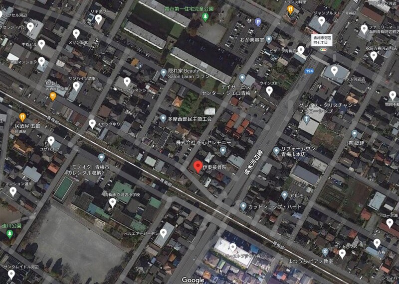 当院は東京都の青梅市にあります。 最近はパソコンやスマートフォンなどの普及で、あまり身体を動かさず、 同じ姿勢を長時間取ることからくる、肩や背中のコリ、腰痛でお困りの患者様がとても増えています。 まずはお客様から症状について詳しくお伺いし、施術を行ってまいります。 患者様の痛みをできるだけ早く取り除き、生活が楽になるように、精一杯施術をいたします。 身体の不調や各部痛みでお困りの場合は、ぜひ伊東接骨院にご相談ください。 ※画像はグーグルから引用しております。 ー-------------------------------------------- 住所 東京都青梅市河辺町9丁目4-7 アクセス 河辺駅から490m