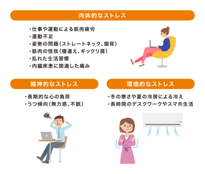 たくさんの方が悩んでいる「肩こり」は、マッサージやツボ押しで治ると思われている方も少なくないでしょう。しかし実は、その元となる原因は、筋肉疲労、寝不足やストレスなど、一人ひとり違います
