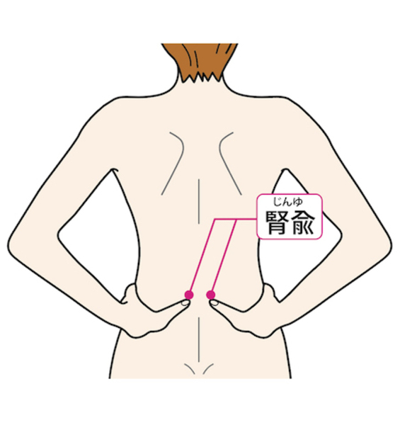 【探し方】腰にあるツボで、左右の骨盤の上端を結んだ高さにあり、背中側の中心線から左右に指2本分外側